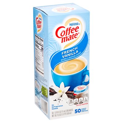 Coffee mate French Vanilla Liquid Creamer Singles (.375 fl oz) WATER, SUGAR, COCONUT OIL, 2% OR LESS OF SODIUM CASEINATE (A MILK DERIVATIVE)**, MONO- AND DIGLYCERIDES, DIPOTASSIUM PHOSPHATE, NATURAL AND ARTIFICIAL FLAVORS, BETA CAROTENE AND RIBOFLAVIN (FOR COLOR). ** Not a source of lactose. Allergens CONTAINS: A MILK DERIVATIVE. % daily values are based on a 2,000 calorie diet RELATED RECIPES