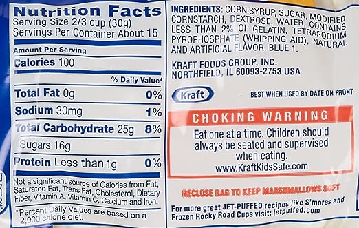 JET-PUFFED Mini Marshmallows, 16 oz. Bag (Pack of 12) Item Number: 10600699660768. Pack Size: 12. Format: Bag. Storage: Shelf Stable. Prep: Jet-Puffed Marshmallows are Ready-to-use as a dessert topping or in your favorite recipe. L x W x H (in.): 2.215 X 12.5 X 7.75. Ingredients: corn syrup, sugar, modified cornstarch, dextrose, water, contains less than 2% of gelatin, tetrasodium pyrophosphate ... Marshmallow nutrition, glycemic index, calories, net carbs & more Carbs per serving size. One regular marshmallow (7.2g) contains 5.85g of carbs. Ten miniature marshmallows (7g) contain 5.69g of carbs, whereas one cup of ten miniatures (50g) contains 40.6g of carbs. ... Serving Size ⓘ Serving sizes are taken from FDA's Reference Amounts Customarily Consumed (RACCs) 1 regular (7.2 grams)