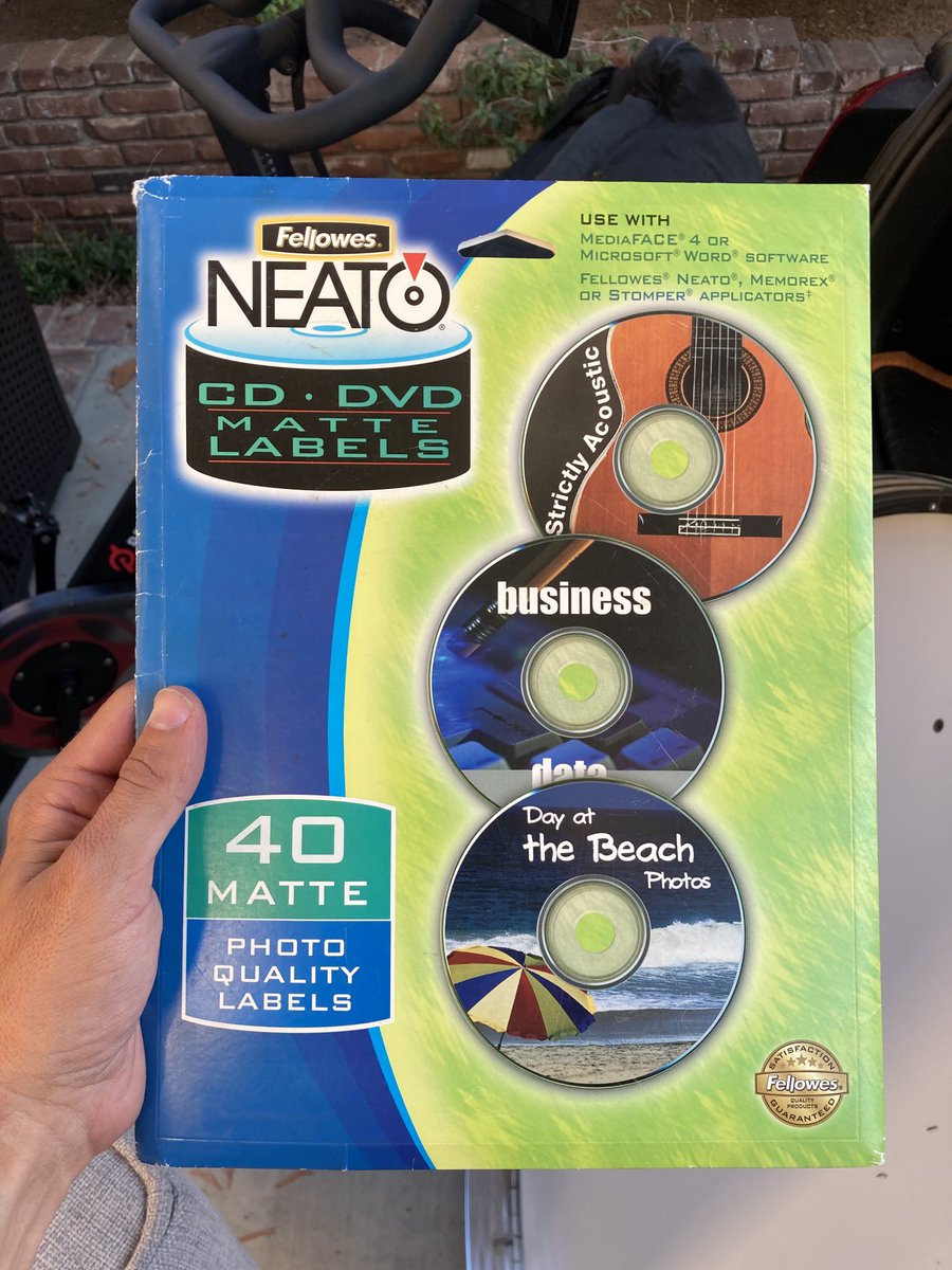 Fellowes neato. Neato sells Blank DVD & CD Labels, Labeling Software & Custom Device Skins EconoMatte CD/DVD Labels- 500 Pack CLP-192215. Our price $59.95. Buy CD/DVD Labels. Great quality - Comes with our Online Software for FREE. Get top quality labels from NEATO. We have been in business over 15 years! Shop Now. Blank Craft Labels. Have fun creating your own labels. CD/DVD Labels - Neato Labels Sort. Best Selling. FULL COVERAGE PHOTOMATTE CD/DVD LABELS $199.95 from $23.95. Sale. NEATO FULL COVERAGE ECONO MATTE WHITE CD/DVD LABEL FOR INKJET & LASER PRINTERS - 50 SHEETS TOTAL $14.95. Sold Out. ECONOMATTE JEWEL CASE BOOKLETS $34.95. Sold Out. PHOTOMATTE SLIM JEWEL CASE INSERTS - 50 Sheets - 100 Total $14.95. Fellowes 98330 NEATO Slim Jewel Cases, Clear/Black, 50-Pack Fellowes 98330 NEATO Slim Jewel Cases, Clear/Black, 50-Pack. Brand: Fellowes. 12 ratings. Takes up half the space of a standard jewel case. Includes area for insert booklet. Product is 100% recyclable. 50 per pack. New (2) from $15.00 & FREE Shipping. cd crystal case. Tech Flashback: Fellowes Neato 2000 CD Labeler Kit The Fellowes Neato 2000 System. The solution, of course, was an "adhesive label" style system, branded as Neato 2000 and sold by Fellowes (an office supplies company). Kits were widely available, and sold even in department stores so that your "average joe" could now enjoy professional (ahem) results. I had never used one of these kits ...