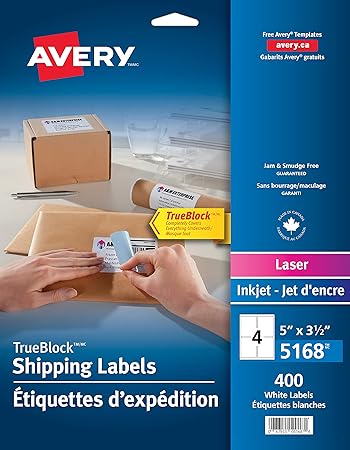 Avery TrueBlock Shipping Labels for Inkjet/Laser Printers, 5" x 3½", White, Rectangle, 400 Labels, Permanent (5168) Made in Canada