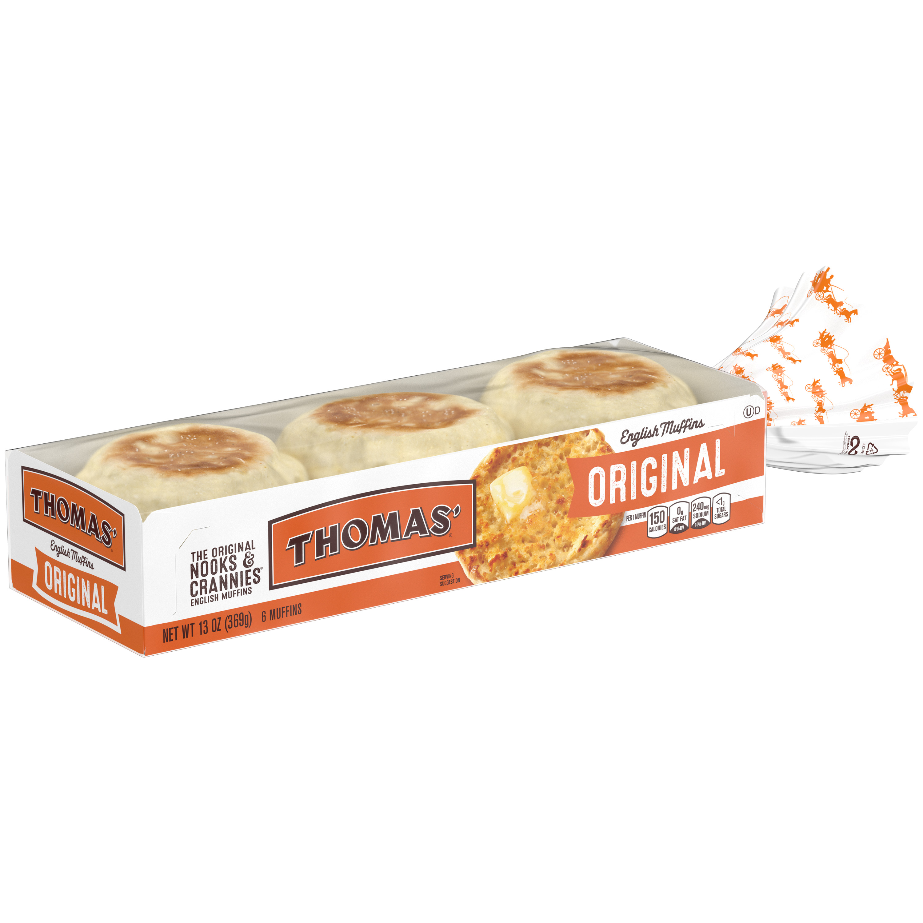 Thomas' Nooks & Crannies Blueberry English Muffins - Harris Teeter Each tray contains six fork-split delicious blueberry English muffins. Nooks & Crannies texture that toasts up crispy on the edges and soft in the middle. Baked with high-quality ingredients, including real blueberries. Enjoy with your favorite spread (we suggest butter or cream cheese) or create a sweet treat for any time of day.