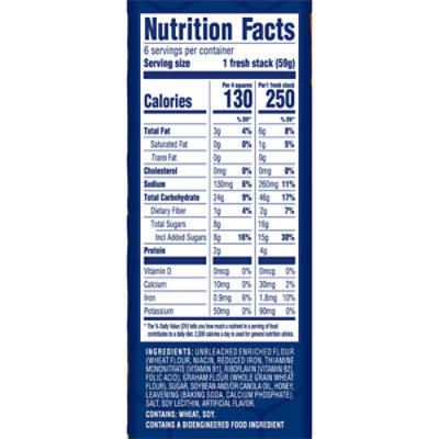 Nabisco Honey Maid Graham Crackers Honey 14.4 oz - SmartLabel™ 8 crackers (31g) Amount Per Serving Calories 130 % Daily Value * Total Fat 3 g 5.0% Saturated Fat 0 g 0.0% Trans Fat 0 g Cholesterol 0 mg 4.0% Sodium 160 mg 7.0% Total Carbohydrate 24 g 8.0% Dietary Fiber 1 g 4.0% Total Sugars 8 g Protein 2 g Calcium 0.0% Iron 6.0% Potassium 1.0% Honey Maid Graham Crackers (14.4-Ounce Boxes, 4-Pack) Unbleached Enriched Flour (Wheat Flour, Niacin, Reduced Iron, Thiamine Mononitrate {Vitamin B1}, Riboflavin {Vitamin B2}, Folic Acid), Graham Flour (Whole Grain Wheat Flour), Sugar, Soybean Oil, Honey, Leavening (Baking Soda and/or Calcium Phosphate), Salt, Soy Lecithin, Artificial Flavor. Legal Disclaimer PDF NABISCO HONEY MAID GRAHAM CRACKERS Nutrition Facts graham flour (whole grain wheat flour), unbleached enriched flour (wheat flour, niacin, reduced iron, thiamine mononitrate {vitamin b1}, riboflavin {vitamin b2}, folic acid), sugar, soybean oil, honey, leavening (baking soda and/or calcium phosphate), salt, wheat starch, artificial flavor.contains: wheat. 14 gr 60 15 11 g 2% 0.0 g 0% 0.0 g 0.0 ... Honey Maid Honey Graham Crackers, Family Size, 25.6 oz Box - Walmart.com Highlights: One family size box of Honey Maid Honey Graham Crackers. Made with real honey for delicious flavor. Square shaped graham snacks have a crunch in each bite. Stack with marshmallows and chocolate for yummy s'mores. Each 31 g serving contains 8 g of whole grain.