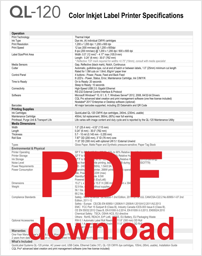 QL-120 Color Label Printer - Portland Printer Place QL-120 Color Label Printer $ 6,995.00 View Brochure - Prints 0.5″ to 4.2″ width Color Labels - 12″ per second print speed - 4 Color Ink System (CYMK), 240ml cartridge size - 1200 dpi Print Resolution - Comes with CQL Advanced Label Design & Print Management software Out of stock