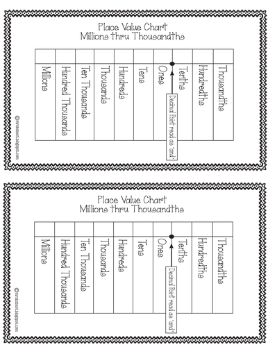 Free printable place value chart (plus activities to try!) Apr 18, 2020 · The third chart is a decimal place value chart showing thousands down to thousandths. This chart allows you to make numbers with up to 3 decimal places. It has the decimal point already on the chart: The last sheet is a place value recording sheet. It has lots of space underneath the place value headings to record numbers.