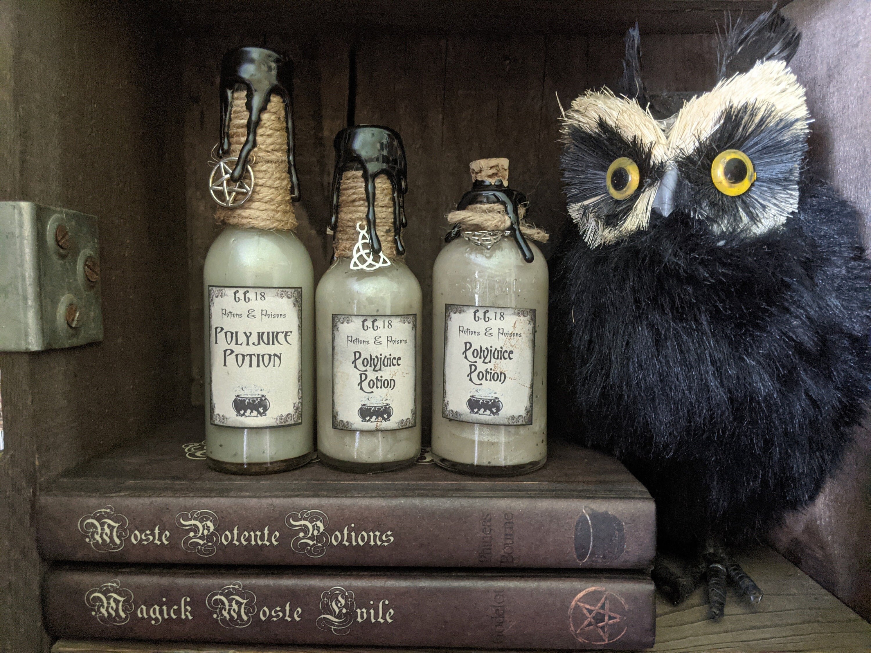 Wizard Potion Labels Printables, HP Polyjuice Potion Label, Editable ... These labels are also perfect to decorate for a famous wizard party with several labels for things like pumpkin juice, Polyjuice potion, invisibility potion, Floo powder, Gillyweed, and more. Both vintage labels and black and white labels are included. 3" Polyjuice Potion &Ingredient Labels Harry Potter Party Prop DIY ... 3" Tall Polyjuice Potion Ingredient Labels Harry Potter Party Prop Apothecary DIY CRAFT. I have a pair of tiny embroidery scissors that I usually use. Expect that it can take you up to an hour to cut them out and you would need good lighting. DIY Apothecary Polyjuice Potion Labels - heathermillerdesign The result is a full set, and even a label for the actual completed Polyjuice Potion, complete with instructions and warnings on the back. Just for funsies, here's a list of what was actually in the bottles for the photos: Polyjuice Potion: Canola oil + Water + Blue food coloring.