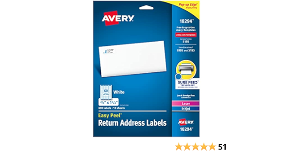 Amazon.com: avery labels 18294 Avery Return Address Labels, Laser/Inkjet, 2/3 x 1-3/4-Inches, White (18294) & Shipping Address Labels, Laser & Inkjet Printers, 100 Labels, 2x4 Labels, Permanent Adhesive, TrueBlock (18163) $1016 $16.78 FREE delivery on $25 shipped by Amazon.