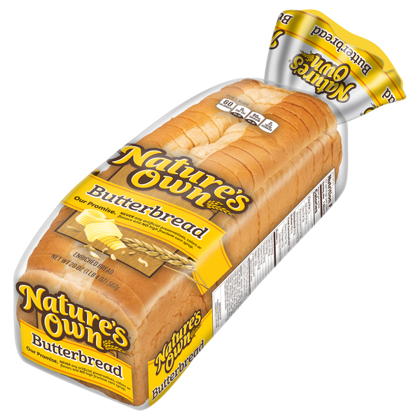 Nature's Own Butterbread Sliced White Bread, 20 oz - Kroger Product Details. If you love the warm, homemade taste of buttered bread, you'll be a fan of Nature's Own® Butterbread. Enjoy the subtle butter flavor baked into every slice. This loaf of white bread contains no artificial preservatives, colors or flavors and no high fructose corn syrup. Plus, with 0 grams of trans fat per serving, Nature's Own ...