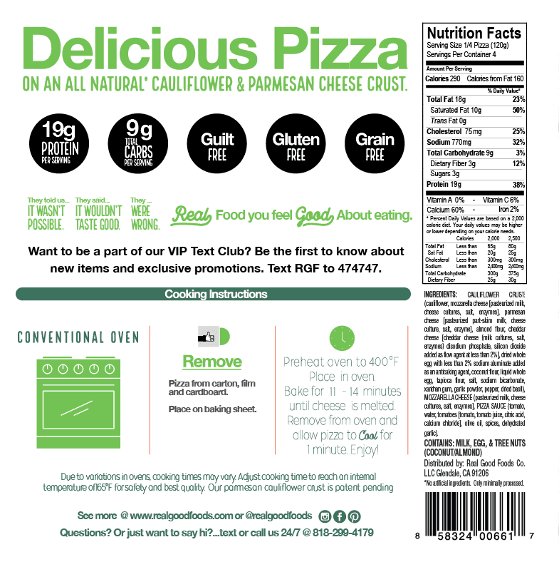Real good pizza calories. Real Good Foods | Frozen Meals | Best Frozen Foods Real Good Foods makes your favorite foods more nutritious, gluten-free, high protein, low carb, keto-friendly frozen meal choices you feel good about eating. Shop Real Good Frozen Meals | Keto Frozen Meals & Meal Prep Grande Chicken Enchiladas $6.99. Grande Cheese Enchiladas $6.99. Spinach Ricotta Cannelloni $6.99. Chicken Alfredo Cannelloni $6.99. Marinara Ricotta Cannelloni $6.99. Broccoli Cheddar Bake Bowl $6.99. Lasagna Bowl $6.99. NEW Lemon Chicken Bowl $6.99. Cauli Mash & Braised Beef Bowl $6.99. Real Good Pizza with Cauliflower Crust (Keto) - Low Carb Yum Real Good Foods just came out with a new and improved frozen cauliflower pizza that's even better tasting than the original version. And it's a great low carb choice as there's just 9 grams of total carbs per serving. Each serving is a quarter slice of the pizza and with 3 grams of fiber, the net carb count is only 6 grams. Calories in Real Good Pizza Co. Margherita Pizza and Nutrition Facts There are 260 calories in 1/4 pizza (120 g) of Real Good Pizza Co. Margherita Pizza. Calorie breakdown: 58% fat, 15% carbs, 27% protein. Related Cheese Pizza from Real Good Pizza Co.: Three Cheese & Uncured Bacon Pizza: Three Cheese Pizza: Related Pizza from Real Good Pizza Co.: