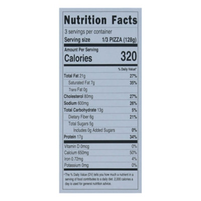 Healthiest Pizza Chains: Pizza Nutrition and Tips for Healthier Pizza Calories: 250 Fat: 10 g Sugar: 1 g Protein: 11 g Sodium: 450 mg Little Caesar's Little Caesar's ties with Pizza Hut for calorie count, with slightly less fat and sodium but a little more... Cauliflower Pizza: Nutrients, Benefits, and a Healthy Recipe Use unsweetened (or even homemade) pizza sauce and avoid cream-based sauces like alfredo. Use smaller portions of cheese — 1 ounce (28 grams) of mozzarella cheese is 80 calories — or low fat... Pizza Calories & Calorie Chart Pizza Calories Although pizza gets a bad rap as a guilty pleasure food, it can have some nutritional value depending on the sauce and toppings. How the pizza crust is made will also affect the number of calories and overall health benefits. Using whole wheat flour instead of white flour increases the amount of complex carbs. Calories in Real Good Pizza Co. Three Cheese Pizza and Nutrition Facts There are 240 calories in 1/2 pizza of Real Good Pizza Co. Three Cheese Pizza. Calorie breakdown: 52% fat, 7% carbs, 41% protein.