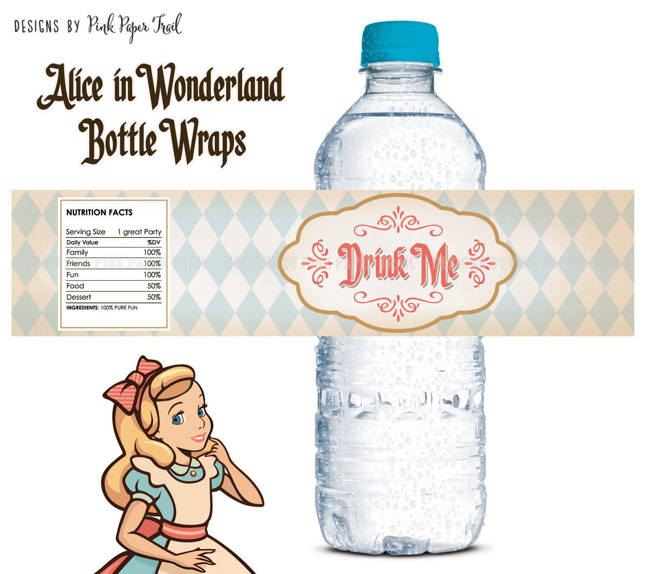 Alice in Wonderland Free Printable 'Drink Me' Water Bottle Labels Alice in Wonderland Free Printable “Drink Me” Water Bottle Labels. TJ Creative Community. Share 1. Pin 83. 84 Shares.