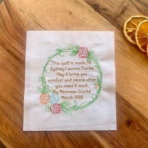40+ Quilt Label Wording Ideas for Gifted Quilts - Hailey Stitches 26 Ιουλ 2021 ... Quilt Label Ideas for Newborns ... May you have warmth and comfort always. Quilting with love for my [niece, nephew, etc]. Made with love and ... 100+ Quilt Label Sayings & Quotes for Every Occasion 6 Δεκ 2022 ... Memory Quilt Label Wording · In memory of [insert name] whose love and laughter filled our lives with such joy. · [deceased's name] loved you with ... Memory Quilt Label - Etsy Results 1 - 40 of 276 ... Check out our memory quilt label selection for the very best in unique or custom, handmade pieces from our appliques & patches shops.
