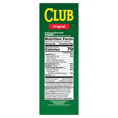 Kellogg's® Club® Original Crackers - SmartLabel™ 70 Calories 0 g Sat Fat 125 mg Sodium 1 g Sugar Nutrition Facts Servings Per Container About 28 Serving Size 4 Crackers (14 g) *The % Daily Value (DV) tells you how much a nutrient in a serving of food contributes to a daily diet. 2,000 calories a day is used for general nutrition advice. Information last updated on 04-05-2022 by Kellogg's